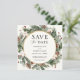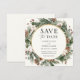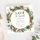 Élégante invitation de sauvegarde de date sur le thème de l'hiver avec un cadre doré entouré d'aiguilles persistantes aquarelles, de pins et de fleurs d'hiver. Personnalisez avec vos informations ou cliquez sur "Cliquez pour personnaliser davantage" pour modifier les styles, la taille et les couleurs des polices. Articles assortis disponibles dans la boutique Zazzle d'Adore Paper Co.