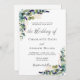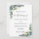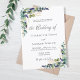 Un arrière - plan blanc décoré de verdure d'eucalyptus aquarellée, de fleurs de lavande et de feuillage doré. Personnalisez et ajoutez vos noms et les détails du mariage.