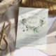 Elégante faire-part de mariage botanique avec aquarelles vert sauge, vert eucalyptus vert, feuilles de laurier et or accents, avec la typographie moderne gris et vos noms dans un script d'or élégant.