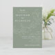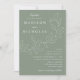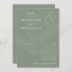 Invitations de mariage botanique avec vos noms et détails mariages en lettres blanches divisées par une vigne de feuilles esquissés avec un arrière - plan vert sage. Les invitations de mariage élégantes se coordonnent avec notre collection de mariages Feuille en cascade.