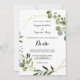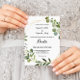 Ce faire-part de mariage feuille tropical vert est parfait pour un mariage de destination espagnole. Le design présente de beaux feuilles verts peints à la main, ornant un cadre géométrique doré.