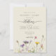 Faire-part de mariage Boho de printemps avec de jolies fleurs botaniques colorées et des fleurs sauvages en violet, rose et jaune. Calligraphie de script et design boho chic minimal.