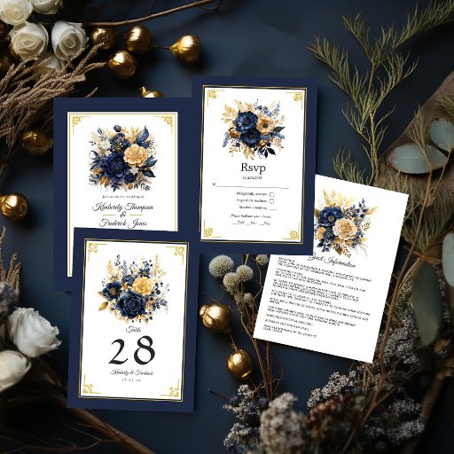 Faire-part de mariage florale bleu marine et or personnalisable selon vos spécificités.