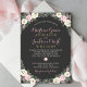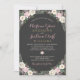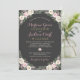 Cette invitation de mariage présente un fond charbon profond encadré de florales roses et ivoire romantiques et de verdure douce. Les noms de police script élégants associés à une typographie sérif propre créent un look moderne-romantique qui convient parfaitement aux célébrations d'automne et d'hiver. Idéal pour les couples qui veulent des florales sombres avec une typographie intemporelle. Invitation de mariage.