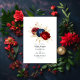 Faire-part de mariage floral couleur rouge pourpre et bleu marine avec feuillage doré faux feuillage et damas en velours vintage inverse.