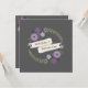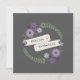 Un faire-part de mariage comportant une illustration des fleurs et de la verdure pourpres a arrangé en cercle avec la bannière au centre. Personnalisez avec des noms. Le bord opposé comporte des fleurs en haut laissées et en bas à droite. Personnalisez le texte avec des détails de votre occasion. L'arrière - plan est gris. Les mots sont des parents de la jeune mariée.