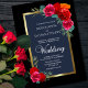 Elégante faire-part de mariage florale rouge et rose avec bordure noire et or et panneau intérieur gris pour mettre en évidence les détails de l'invitation.