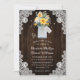 Faire-part de mariage fleurie jaune rustique avec un bouquet de fleurs jaunes et de verdure à l'intérieur d'un bocal de maçon contre un arrière - plan en bois de grange orné de dentelle fleurie blanche et de lumières scintillantes. Un design de carte parfait pour inviter vos invités à votre mariage rustique jaune.