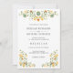 Invitations de mariage artistique avec fleurs jaunes, orange et turquoises, vignes et feuilles en haut et dans les deux coins inférieurs, sur un arrière - plan blanc. Vos détails sont au milieu, dans une sans serif. Le côté arrière est vert et peut être changé à n'importe quelle couleur que vous souhaitez. Ce design est idéal pour un mariage de jardin en été.