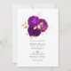 Faire-part de mariage fleurie violet et or personnalisable selon les spécificités de votre événement. Idéal pour un thème ou un mariage de jardin. Le code QR au verso dirige vers votre site mariage où les gens peuvent en savoir plus et rsvp.