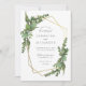 faire-part de mariage d'été chic avec une aquarelle de verdure botanique et un cadre géométrique faux or avec une typographie design et moderne exposant vos détails. Cette invitation revient à un arrière - plan vert foncé avec un délicat motif botanique.
