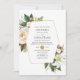 Faire-part de mariage fleurie avec pivoines roses, herbes sauvages, coton et lys avec cadre géométrique or personnalisable selon vos spécifications.