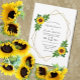 Le design présente des tournesols et des feuilles botaniques sur un cadre géométrique imprimé couleur or.