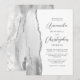 Le bord gauche de ce faire-part de mariage moderne élégant présente une bordure d'agate aquarelle grise et blanche rehaussée de paillettes argentées fausses. Le texte personnalisable combine des polices script et sans empattement en gris charbon sur fond blanc. Le verso présente un motif agate gris et argent assorti.