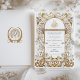 Cette faire-part de mariage islamique harmonise magnifiquement les éléments traditionnels avec le style Art Nouveau. L'entrée de l'invitation présente une magnifique arcade ornée de faux feuilles dorés et de fleurs blanches, encastrant le Bismillah arabe doré, symbolisant le début d'une union bénite. L'envers présente un délicat arbre doré, qui écrase les initiales dans ses racines, signifiant les vies entremêlées du couple. La palette de couleurs est une combinaison luxueuse d'or champagne, de blanc crémeux, de touches douces de caramel et de bronze, offrant un charme vintage et intemporel. Cette invitation est une faire-part parfaite pour les couples qui apprécient le mélange de signification culturelle et d'élégance artistique.