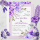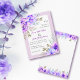 Faire-part de mariage lilas fleuri à l'aquarelle violette. Il présente des bouquets de fleurs dans les tons violets et bleus aux coins tandis que votre texte est placé dans un cadre blanc avec une bordure lilas. L'arrière comprend des guirlandes fleuries sur les parties supérieure et inférieure.