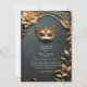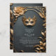 Évoquez la magie d'une boule mascarade avec cette faire-part de mariage exquise. Un arrière - plan noir de charbon de bois, orné d'un décor ornemental complexe, simulé d'or, de feuillage et de fleurs en 3D, crée une atmosphère luxueuse et enchanteresse. Le masque de mascarade doré prend le centre de la scène, ajoutant un élément de mystère et de glamour à votre journée spéciale.