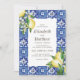 Composé de typographie serif et cursive. Le tout dans un décor aquarelle de tuiles espagnoles méditerranéennes bleues et blanches avec feuilles de feuillage verdoyant, citrons et plantes florales sauvages. Il est conçu par White Paper Birch Co., exclusif pour Zazzle. Disponible ici : http://www.zazzle.com/store/whitepaperbirch