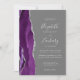 Le bord gauche de cette élégante faire-part de mariage moderne est orné d'une bordure d'aquarelle violette ornée d'une parties scintillant en faux argent. Le texte personnalisable combine écriture gris argenté pâle, copperplate et polices italiques sur un arrière - plan gris moyen. L'envers est assorti d'un design d'agate violet et argenté.