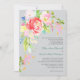 Un joli bouquet fleuri printanier aux couleurs de corail rose, lavande rose, blanc, jaune pâle, or et bleu niché parmi les feuilles verts au coin supérieur gauche de ce faire-part de mariage. La conception s'étend en bas à gauche, formant un joli cadre pour votre texte personnalisé. Le texte est en gris et bleu vert à droite. L'aquarelle florale et le texte sont placés sur un arrière - plan gris clair, qui complète les couleurs vives des fleurs. Le fond de l'invitation est de la même couleur grise. Belle pour les mariages du printemps, de l'été et de l'automne !