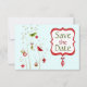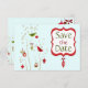 Cette annonce de mariage "Save the Date" Christmas Winter Birds Wedding présente des nuances de vert, de rouge, de beige et a un fond bleu pâle. Il y a deux oiseaux charmants qui décorent un arbre avec des ornements par une belle journée enneigée.