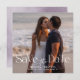 Une police de typographie audacieuse très moderne forme l'expression classique Save The Date sur le devant avec un motif abstrait lavande sur le dos. Customisez facilement avec votre photo, les détails du mariage et l'URL du site Web du mariage à l'avant et à l'arrière.