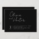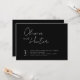 Cette faire-part de mariage moderne a un arrière - plan noir intemporel et élégant texte moderne. Le prénom est un script écrit à la main fleuri et le deuxième nom est une police serif forte, donnant à cette invitation l'équilibre parfait entre masculin et féminin. A l'arrière, il y a une option pour utiliser une photo. Ajoutez un code QR et des instructions en ligne rsvp pour en faire une faire-part de mariage tout-en-un moderne.