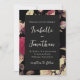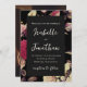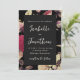 Faire-part de mariage florale romantique moody avec un magnifique script de calligraphie et un motif floral noir spectaculaire avec une photo complète.