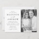 Faire-part de mariage photo moderne avec vos détails mariages à gauche du design en lettres noires avec accents de script de calligraphie. Personnalisez l'avant de l'invitation en ajoutant vos noms, les détails du mariage et la photo verticale du fiançailles. L'arrière de l'invitation offre de l'espace pour le texte et les photos supplémentaires. Conçu pour coordonner avec notre collection de mariages Modern Elegance.