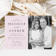 Faire-part de mariage photo moderne avec vos détails mariages à gauche du design en lettres noires avec accents de script de calligraphie sur un arrière - plan lavande violet clair. Personnalisez l'avant de l'invitation en ajoutant vos noms, les détails du mariage et la photo verticale du fiançailles. L'arrière de l'invitation offre de l'espace pour le texte et les photos supplémentaires. Conçu pour coordonner avec notre collection de mariages Modern Elegance.