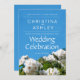 Beau faire-part de mariage fleuri aux roses blanches oniriques et ciel d'été bleu clair.