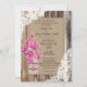 Conception de cartes de faire-part de mariage rustiques avec orchidée magenta dans un bocal de mason enveloppé de burlap, dentelle, dentelle de ficelle et de blanc sur des planches de arrière - plan à l'aspect lin et de grange avec un coeur gravé de monogramme à l'arrière.