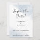 Cette simple carte de Save the Date pour un mariage minimaliste sur la plage présente des polices de caractères classiques et modernes sur un fond aquarelle abstrait inspiré de l'océan de couleur bleu poussiéreux et blanc. Vous pouvez facilement personnaliser cette invitation de save-the-date de mariage sur l'océan avec vos propres détails en utilisant ce design sur le thème de l'océan et cette palette de couleurs côtières. Il est polyvalent et peut être utilisé pour correspondre à de nombreuses idées et décorations de mariage sur le thème de la plage. Ces invitations de mariage sur la plage minimalistes et élégantes conviennent aux mariages tropicaux ainsi qu'aux mariages nautiques dans des climats plus frais. Parfait pour les couples qui aiment la mer (ou les peintures aquarelles artistiques modernes !).