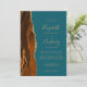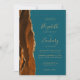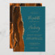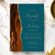 Le bord gauche de cette élégante faire-part de mariage moderne est orné d'une bordure d'aquarelle orange brûlée, recouverte d'une parties scintillant en faux or. Le texte personnalisable combine écriture manuscrite dorée, cuivre et polices italiques sur un arrière - plan turquoise. L'envers est assorti d'une agate orange brûlée et dorée.