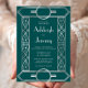 Cette élégante faire-part de mariage d'inspiration vintage présente du texte gris argenté sur un arrière - plan bleu turquoise, encadré par une bordure vintage géométrique en faux papier argenté. L'envers est turquoise.