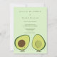 Un faire-part de mariage vertical avec une touche de plaisir. Soyez représentés par deux joyeuses demi-illustrations d'avocat, profondément amoureuses. Cette invitation mélange une joie fantasque avec assez d'élégance pour que vous puissiez concevoir votre mariage comme vous le souhaitez. L'invitation est fait dans les tons verts. Placez vos noms et informations sur cette invitation, ajoutez-le à votre panier et faites un merveilleux mariage.