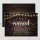 Mariés, Faire-part / Carte d'invitation de mariage en fuite, sur fond de bois de ferme rustique, avec guirlande de lumières. C'est parfait pour votre réception de mariage et fête de célébration après le mariage. Ajoutez vos détails dans la même police / lettrage.