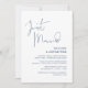 Ceci est la carte d'invitation pour la fête de mariage en elopement, avec un design minimaliste / minimaliste élégant de script Bleu Nuit (Just Married)