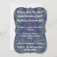 Couple de mariés squelettes effrayants et charmants qui brillent. Caractéristiques de design de style vintage avec lustre et arrière-plan orné. Le couple se promène main dans la main. Cette invitation Halloween convient bien aux bals costumés, cocktails, soirée Halloween et mariage d'Halloween. Caractéristiques bleu sarcelle, blancs, noir et violet.