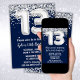 Marine bleu argent et blanc 13e anniversaire invitation 13 anniversaire de fête d'invitation pour un noir blanc argent avec l'écriture de script moderne et des ballons de papier amusant.