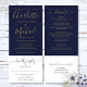 Un faire-part de mariage tout en un avec des noms de script signature or moderne et une typographie élégante sur un arrière - plan bleu marine. L'invitation comprend une carte RSVP qui peut être coupée et des informations sur les invités. Conçu par Thisisnotme©