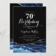 Bleu marine, noir et argent agate 70e anniversaire invitation de fête. Elégant design moderne avec aquarelle bleu royal agate marbre arrière - plan, faux parties scintillant argent et typographie script police. Carte invitation branchée parfaite pour une célébration anniversaire féminine élégante. Invitations Zazzle imprimées ou téléchargement instantané modèle imprimable numérique.