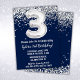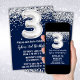 Marine bleu et argent 3e anniversaire invitation de fête âge 3 anniversaire invitation de fête avec parties scintillant et écriture de script moderne et des ballons de papier amusant.