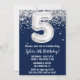 Marine bleu et argent 5e anniversaire invitation à la fête d'âge 5 anniversaire invitation à la fête d'anniversaire avec parties scintillant et écriture de script moderne et ballons de papier amusant.