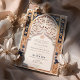 Cette invitation est une étonnante exposition d'art islamique, avec une élégante palette bleu marine et or. L'avant de l'invitation présente un motif arabesque sophistiqué aux motifs floraux blancs délicats et aux ornements dorés, encadré de colonnes bleu marine aux accents floraux dorés. Ce design luxueux est équilibré par un décor bleu marine, créant un contraste riche et profond qui respire l'élégance. L'arrière complète l'avant par une disposition plus simple, axée sur les détails dorés ornés par rapport au bleu marine. Parfait pour les couples à la recherche d'une atmosphère classique mais opulente pour leur mariage, cette invitation relie les motifs islamiques traditionnels à un sens moderne du style.