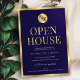 Créez des invitations d'événements professionnels à domicile avec cette invitation à la Maison ouverte bleu et or de la Marine. Cette invitation à l'événement Open house bleu marine et faux or de l'entreprise offre un aménagement minimal avec de l'espace pour votre logo et les détails de l'événement, parfait pour les invités invitations à votre New Office, Business Ouverture ou House Party.