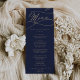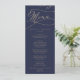 Cette carte romantique marine et or imprimé ou imprimable est parfaite pour un mariage simple. Le design classique moderne comprend des tourbillons fantaisistes et des fleurs fantaisistes avec une magnifique typographie de feuille d'or en faux champagne. Ce menu peut être utilisé pour une réception de mariage, un dîner de répétition ou tout événement. Remarque : Ce design ne comporte pas de véritable feuille d'or. C'est un graphisme de haute qualité fait pour ressembler à du papier doré.