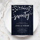 Invitation à la fête du 70e anniversaire. Design rustique avec motif en bois de marine. Carte invitation classique avec lumières à cordes de fées et police de caractères en script blanc. Parfait pour une célébration anniversaire de soixante-dixième année. Personnalisez avec vos propres détails. Peut être customisé pour n'importe quel âge ! Invitations Zazzle imprimées ou téléchargement instantané modèle imprimable numérique.