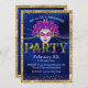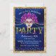 Cette invitation personnalisée à la fête présente un thème glamour de la mascarade Mardi Gras. Un masque est représenté au centre avec des perles Mardi Gras violettes, dorées et vertes collées de chaque côté. Un cadre de paillettes d'or borde l'invitation et les diamants de la parties scintillant d'or sont aspergés de confettis le long des parties supérieure et inférieure.