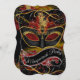 Invitation Masquerade Rouge & Or. Masque de plumes élégant avec poussière et perles étincelantes.